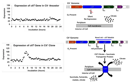 The researchers also found that all Cit+ clones had mutations in which a 2933-base-pair segment of DNA was duplicated or amplified. The duplicated segment contained the gene citT for the citrate transporter protein used in anaerobic growth on citrate. The duplication is tandem, and resulted in copies that were head-to-tail with respect to each other. This new configuration placed a copy of the previously silent, unexpressed citT under the control of the adjacent rnk gene's promoter, which directs expression when oxygen is present. This new rnk-citT module produced a novel regulatory pattern for citT, activating expression of the citrate transporter when oxygen was present, and thereby enabled aerobic growth on citrate.[8]
