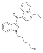 EAM-2201 (4'-ethyl-AM-2201, 5"-fluoro-JWH-210, SGT-14) is a drug that presumably acts as a potent agonist for the cannabinoid receptors.[1] It had never previously been reported in the scientific or patent literature, and was first identified by laboratories in Japan in July 2012 as an ingredient in synthetic cannabis smoking blends[2] Like the closely related MAM-2201 which had been first reported around a year earlier, EAM-2201 thus appears to be another novel compound invented by designer drug suppliers specifically for recreational use. Structurally, EAM-2201 is a hybrid of two known cannabinoid compounds JWH-210 and AM-2201, both of which had previously been used as active ingredients in synthetic cannabis blends before being banned in many countries.