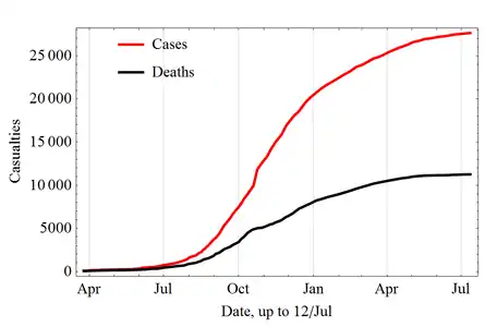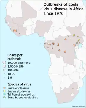The disease was first identified in 1976, in two simultaneous outbreaks: one in Nzara (a town in South Sudan) and the other in Yambuku (Democratic Republic of the Congo), a village near the Ebola River from which the disease takes its name.[1] EVD outbreaks occur intermittently in tropical regions of sub-Saharan Africa.[1] From 1976 to 2012, the World Health Organization reports 24 outbreaks involving 2,387 cases with 1,590 deaths.[1][12] The largest outbreak to date was the epidemic in West Africa, which occurred from December 2013 to January 2016, with 28,646 cases and 11,323 deaths.[13][14][15] It was declared no longer an emergency on 29 March 2016.[16] Other outbreaks in Africa began in the Democratic Republic of the Congo in May 2017,[17][18] and 2018.[19][20] In July 2019, the World Health Organization declared the Congo Ebola outbreak a world health emergency.[21]