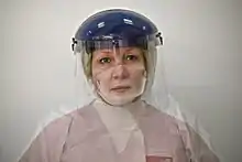 People who care for those infected with Ebola should wear protective clothing including masks, gloves, gowns and goggles.[109] The U.S. Centers for Disease Control (CDC) recommend that the protective gear leaves no skin exposed.[110] These measures are also recommended for those who may handle objects contaminated by an infected person's body fluids.[111] In 2014, the CDC began recommending that medical personnel receive training on the proper suit-up and removal of personal protective equipment (PPE); in addition, a designated person, appropriately trained in biosafety, should be watching each step of these procedures to ensure they are done correctly.[110] In Sierra Leone, the typical training period for the use of such safety equipment lasts approximately 12 days.[112]