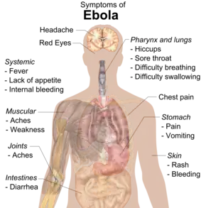 Ebola, also known as Ebola virus disease (EVD) or Ebola hemorrhagic fever (EHF), is a viral hemorrhagic fever of humans and other primates caused by ebolaviruses.[1] Signs and symptoms typically start between two days and three weeks after contracting the virus with a fever, sore throat, muscular pain, and headaches.[1] Vomiting, diarrhoea and rash usually follow, along with decreased function of the liver and kidneys.[1] At this time, some people begin to bleed both internally and externally.[1] The disease has a high risk of death, killing 25% to 90% of those infected, with an average of about 50%.[1] This is often due to shock from fluid loss, and typically follows six to 16 days after symptoms appear.[2]