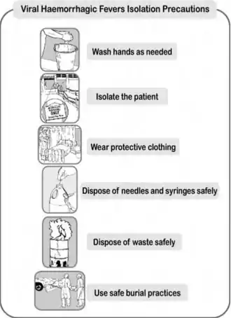 The infected person should be in barrier-isolation from other people.[109] All equipment, medical waste, patient waste and surfaces that may have come into contact with body fluids need to be disinfected.[111] During the 2014 outbreak, kits were put together to help families treat Ebola disease in their homes, which included protective clothing as well as chlorine powder and other cleaning supplies.[113] Education of caregivers in these techniques, and providing such barrier-separation supplies has been a priority of Doctors Without Borders.[114]