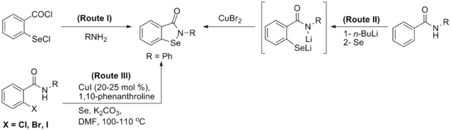 Generally, synthesis of the characteristic scaffold of ebselen, the benzoisoselenazolone ring system, can be achieved either through reaction of primary amines (RNH2) with 2-(chloroseleno)benzoyl chloride (Route I),[12][13] by ortho-lithiation of benzanilides followed by oxidative cyclization (Route II) mediated by cupric bromide (CuBr2),[14] or through the efficient Cu-catalyzed selenation / heterocyclization of o-halobenzamides, a methodology developed by Kumar et al.[15] (Route III).