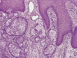 Eccrine carcinoma is a rare skin condition characterized by a plaque or nodule on the scalp, trunk, or extremities.[1]:669 It originates from the eccrine sweat glands of the skin, accounting for less than 0.01% of diagnosed cutaneous malignancies.[2] Eccrine carcinoma tumors are locally aggressive with a high rate of recurrence. Lack of reliable immunohistochemical markers and similarity to other common tumors has made identification of eccrine carcinoma difficult.[2]