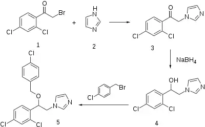 Alkylation of imidazole (2) with bromoketone (1) prepared from o,p-dichloroacetophenone affords the displacement product (3). Reduction of the ketone with sodium borohydride gives the corresponding alcohol (4). Alkylation of the alkoxide from that alcohol with p-chlorobenzyl chloride leads to econazole (5); alkylation with o,p-dichlorobenzyl chloride gives miconazole.