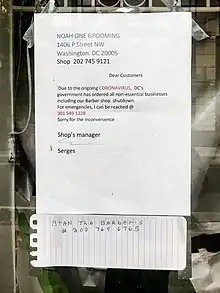 The pandemic has impacted the restaurant business. In the beginning of March 2020, some major cities in the US announced that bars and restaurants would be closed to sit-down dinners and limited to takeout orders and delivery.[88] Later in the month, many states put in place restrictions that required restaurants to be takeout or delivery only.[89] Some employees were fired, and more employees lacked sick leave in the sector compared to similar sectors.[90][91] With only carry-out and delivery services, most servers and bartenders were laid off, prompting these employees creating "virtual tip jars" across 23 U.S. cities.[92] In the United States, an initiative known as the "Great American Takeout" called on people under quarantine to support local restaurants each Tuesday by ordering takeout for curbside pickup or using food delivery services. It began in late March 2020.[93]