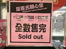 Supply shortages are expected to affect a number of sectors due to panic buying, increased usage of goods to fight the pandemic, and disruption to factories and logistics in mainland China. There have been instances of price gouging.[3] There have been widespread reports of shortages of pharmaceuticals,[4] with many areas seeing panic buying and consequent shortages of food and other essential grocery items.[5][6][7] The technology industry, in particular, has been warning about delays to shipments of electronic goods.[8]