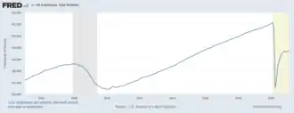 In March 2020, more than 10 million Americans lost their jobs and applied for government aid.[125] Total nonfarm jobs fell from a high of 152.5 million in February 2020 to 130.2 million in April. As of February 2021, the US had 13 million nonfarm jobs.[126]
