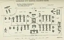 The hospital was on a greenfield site at Colinton on the southern outskirts of the city. It was built close to the Edinburgh City (Craiglockhart) Poorhouse, (which later became Greenlea Old People's Home,[3] and was redeveloped in the 1980s as residential housing known as The Steils.)[4] The Third City Hospital, now known as the Colinton Mains Fever Hospital, was designed by the Edinburgh City architect Robert Morham, who had toured European fever hospitals to incorporate their best features into his design. In Berlin he was told by Robert Koch that "sunlight is the great germicide", and this advice was followed.[5] The hospital was built in red sandstone and consisted of fifteen two-storey Nightingale pavilions separated by grassy airing grounds to ensure spacing between wards and give them greater exposure to light. All included balconies and sun rooms. There were separate blocks for patients with individual diseases together with isolation cottages. In addition there was a nurses' home, accommodation for doctors, a central administrative block and a bacteriology laboratory. The hospital was surrounded by lawns and a small tree plantation.[5]
