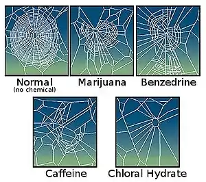 In 1948, Swiss pharmacologist Peter N. Witt started his research on the effect of drugs on spiders. The initial motivation for the study was a request from his colleague, zoologist H. M. Peters, to shift the time when garden spiders build their webs from 2am–5am, which apparently annoyed Peters, to earlier hours.[4] Witt tested spiders with a range of psychoactive drugs, including amphetamine, mescaline, strychnine, LSD, and caffeine, and found that the drugs affect the size and shape of the web rather than the time when it is built. At small doses of caffeine (10 µg/spider), the webs were smaller; the radii were uneven, but the regularity of the circles was unaffected. At higher doses (100 µg/spider), the shape changed more, and the web design became irregular. All the drugs tested reduced web regularity except for small doses (0.1–0.3 µg) of LSD, which increased web regularity.[2]