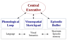 Working memory (WM), similar to STM, is the ability to temporarily store information in order to manipulate it for performing complex tasks, such as reasoning. WM is affected to a greater extent by stress than Long-term memory.[32] Stress has been shown to both improve and impair WM. In a study by Duncko et al., the positive effect of stress manifested itself as a decreased reaction time in participants, while the negative effect of stress causes more false alarms and mistakes when compared to a normal condition.[33] The researchers hypothesize that this could be representative of faster information processing, something helpful in a threatening situation. Anxiety has also been shown to adversely affect some of the components of WM, those being the phonological loop, the visuo-spatial sketchpad, and the central executive.[34] The phonological loop is used for auditory STM, the visuo-spatial sketchpad is used for visual and spatial STM, and the central executive links and controls these systems.[31] The disruption of these components impairs the transfer of information from WM to LTM, thus affecting learning. For instance, several studies have demonstrated that acute stress can impair working memory processing likely though reduced neural activity in the prefrontal cortex in both monkeys and humans.[35]