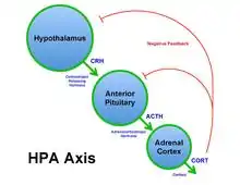 When a receptor within the body senses a stressor, a signal is sent to the anterior hypothalamus. At the reception of the signal, corticotrophin-releasing factor (CRF) acts on the anterior pituitary. The anterior pituitary in turn releases adrenocorticotropic hormone (ACTH).[12][13] ACTH induces the release of corticosteroids and aldosterone from the adrenal gland. These substances are the main factors responsible for the stress response in humans. Cortisol for example stimulates the mobilization of free fatty acids and proteins and the breakdown of amino acids, and increases serum glucose level and blood pressure,[11] among other effects.[14] On the other hand, aldosterone is responsible for water retention associated with stress. As a result of cells retaining sodium and eliminating potassium, water is retained and blood pressure is increased by increasing the blood volume.