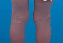 Young children may exhibit dermatitis/eczema on face, scalp and other parts of the body, in older children knees and elbows are more commonly afflicted. Children with dermatitis are at greater than expected risk of also exhibiting asthma and allergic rhinitis.[17]