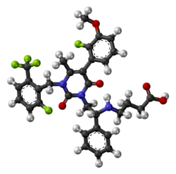Elagolix, sold under the brand name Orilissa, is a gonadotropin-releasing hormone antagonist (GnRH antagonist) medication which is used in the treatment of pain associated with endometriosis in women.[1][5][6][4][2][7][8] It is also under development for the treatment of uterine fibroids and heavy menstrual bleeding in women.[8] The medication was under investigation for the treatment of prostate cancer and enlarged prostate in men as well, but development for these conditions was discontinued.[8] Elagolix is taken by mouth once or twice per day.[1][8] It can be taken for up to 6 to 24 months, depending on the dosage.[1]