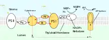 After being released from PSII, PQH2 travels to the cytochrome b6f complex which then transfers two electrons from PQH2 to plastocyanin in two separate reactions. The process that occurs is similar to the Q-cycle in Complex III of the electron transport chain. In the first reaction, PQH2 binds to the complex on the lumen side and one electron is transferred to the iron-sulfur center which then transfers it to cytochrome f which then transfers it to plastocyanin. The second electron is transferred to heme bL which then transfers it to heme bH which then transfers it to PQ. In the second reaction, a second PQH2 gets oxidized, adding an electron to another plastocyanin and PQ. Both reactions together transfer four protons into the lumen.[25][26]