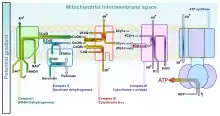 Electrochemical gradients also play a role in establishing proton gradients in oxidative phosphorylation in mitochondria. The final step of cellular respiration is the electron transport chain. Four complexes embedded in the inner membrane of the mitochondrion make up the electron transport chain. However, only complexes I, III, and IV pump protons from the matrix to the intermembrane space (IMS). In total, there are ten protons translocated from the matrix to the IMS which generates an electrochemical potential of more than 200mV. This drives the flux of protons back into the matrix through ATP synthase which produces ATP by adding an inorganic phosphate to ADP.[7] Thus, generation of a proton electrochemical gradient is crucial for energy production in mitochondria.[8] The total equation for the electron transport chain is: