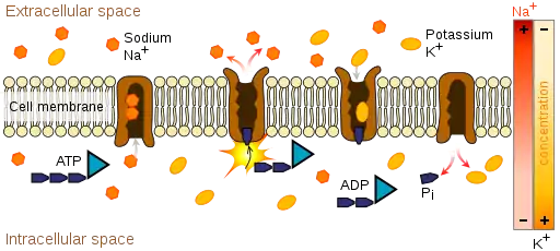An electrochemical gradient is analogous to the water pressure across a hydroelectric dam. Membrane transport proteins such as the sodium-potassium pump within the membrane are equivalent to turbines that convert the water's potential energy to other forms of physical or chemical energy, and the ions that pass through the membrane are equivalent to water that ends up at the bottom of the dam. Also, energy can be used to pump water up into the lake above the dam. In similar manner, chemical energy in cells can be used to create electrochemical gradients.[4][5]
