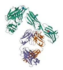 ![]() Emactuzumab light (purple) and heavy (orange) chains complexed with CSF-1R (green) | |