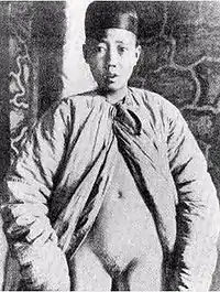 Emasculation was performed in China on men to create palace eunuchs for the Imperial court.[21] The practice dates back to the Shang dynasty (1600–1046 BC)[22] and continued up until 1924,[23] when the eunuch system was abolished by the last emperor of China, Puyi.[24] The last living palace eunuch, Sun Yaoting, died in 1996.[25]
