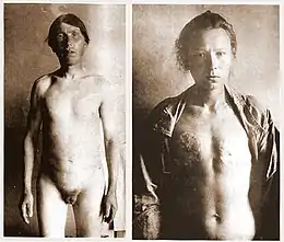 Emasculation was one form of genital mutilation practiced by the Skoptsy, a Russian Christian sect. For males, the other form of mutilation available was castration, whereas females could remove their nipples, breasts, labia majora, labia minora or clitoris.[38] These practices may have begun sometime during the 1760s, after the sect was founded by Kondratii Selivanov, although they were only discovered by the broader community in 1772.[39] They continued up until the 1930s, when the sect was destroyed and its members sentenced.[40]