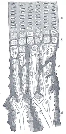 ![]() Light micrograph of undecalcified epiphyseal plate showing endochondral ossification: healthy chondrocytes (top) become degenerating ones (bottom), characteristically displaying a calcified extracellular matrix. | |
