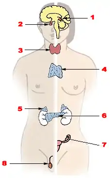 1 Pineal gland 2 Pituitary gland 3 Thyroid gland 4 Thymus 5 Adrenal gland 6 Pancreas 7 Ovary (female)