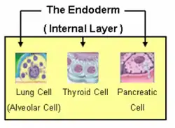 Endoderm is the innermost of the three primary germ layers in the very early embryo. The other two layers are the ectoderm (outside layer) and mesoderm (middle layer), with the endoderm being the innermost layer.[1] Cells migrating inward along the archenteron form the inner layer of the gastrula, which develops into the endoderm.