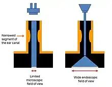 Endoscopic ear surgery (EES), is a minimally invasive alternative to traditional ear surgery and is defined as the use of the rigid endoscope, in contrast to the operating room microscope, to visualize the middle and inner ear during otologic surgery.[1] During endoscopic ear surgery the surgeon holds the endoscope in one hand while working in the ear with the other. To allow this kind of single-handed surgery, different surgical instruments have to be used. Endoscopic visualization has improved due to high-definition video imaging and wide-field endoscopy, and being less invasive, EES is gaining importance as an adjunct to microscopic ear surgery.