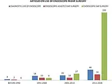 The indications for this relatively new technique are evolving. The use of rigid endoscopes to perform ear surgery (operative EES), rather than just to visualize the contents of the middle ear (observational EES), is increasing as optimized instrumentation and operative approaches become available.[7] The number of citations published in the literature on this topic has skyrocketed rcently with much of the interest focused on the use the endoscope as the main workhorse in otologic surgery rather than using the for observation or as an adjunct to microscopic surgery.[7]