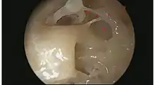 Surgery for cholesteatoma offers the most advantages for using the endoscope instead of the microscope. Failures in cholesteatoma surgery are most common in certain areas of the anatomy of the tympanic cavity, such as the facial recess, sinus tympani, anterior attic, and the protympanum which are poorly accessed with the microscope.[11] The endoscope with its abiltiy to see around the corners can visualize certain areas that are notorius for residual cholesteatoma such as the sinus tympani.[12]
