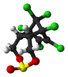Endosulfan is a derivative of hexachlorocyclopentadiene, and is chemically similar to aldrin, chlordane, and heptachlor. Specifically, it is produced by the Diels-Alder reaction of hexachlorocyclopentadiene with cis-butene-1,4-diol and subsequent reaction of the adduct with thionyl chloride. Technical endosulfan is a 7:3 mixture of stereoisomers, designated α and β. α- and β-Endosulfan are configurational isomers arising from the pyramidal stereochemistry of the teravalent sulfur. α-Endosulfan is the more thermodynamically stable of the two, thus β-endosulfan irreversibly converts to the α form, although the conversion is slow.[16][17]