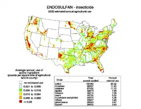 - 2002: The U.S. Fish and Wildlife Service recommended that endosulfan registration should be cancelled,[19] and the EPA determined that endosulfan residues on food and in water pose unacceptable risks. The agency allowed endosulfan to stay on the US market, but imposed restrictions on its agricultural uses.[14]