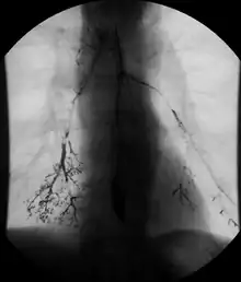 ![]() Normal barium swallow fluoroscopic image, showing the ingested barium sulfate being induced down the oesophagus by peristalsis. | |