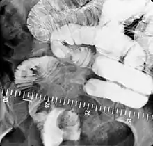 Various types of barium X-ray examinations are used to examine different parts of the gastrointestinal tract. These include barium swallow, barium meal, barium follow-through, and barium enema.[2] The barium swallow, barium meal, and barium follow-through are together also called an upper gastrointestinal series (or study), whereas the barium enema is called a lower gastrointestinal series (or study).[3] In upper gastrointestinal series examinations, the barium sulfate is mixed with water and swallowed orally, whereas in the lower gastrointestinal series (barium enema), the barium contrast agent is administered as an enema through a small tube inserted into the rectum.[2]