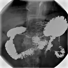 An upper gastrointestinal series, also called a barium meal, is a series of radiographs used to examine the gastrointestinal tract for abnormalities. A contrast medium, usually a radiocontrast agent such as barium sulfate mixed with water, is ingested or instilled into the gastrointestinal tract, and X-rays are used to create radiographs of the regions of interest. The barium enhances the visibility of the relevant parts of the gastrointestinal tract by coating the inside wall of the tract and appearing white on the film. This in combination with other plain radiographs allows for the imaging of parts of the upper gastrointestinal tract such as the pharynx, larynx, esophagus, stomach, and small intestine such that the inside wall lining, size, shape, contour, and patency are visible to the examiner. With fluoroscopy, it is also possible to visualize the functional movement of examined organs such as swallowing, peristalsis, or sphincter closure. Depending on the organs to be examined, barium radiographs can be classified into "barium swallow", "barium meal", "barium follow-through", and "enteroclysis" ("small bowel enema"). To further enhance the quality of images, air or gas is sometimes introduced into the gastrointestinal tract in addition to barium, and this procedure is called double-contrast imaging. In this case the gas is referred to as the negative contrast medium. Traditionally the images produced with barium contrast are made with plain-film radiography, but computed tomography is also used in combination with barium contrast, in which case the procedure is called "CT enterography".[1]
