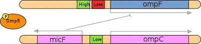 EnvZ is a sensor-transmitter that spans the inner cytoplasmic membrane and has historically been divided into two domains, the sensory and the transmitter domain.[3][4] The protein is composed of a short N-terminal tail in the periplasm, two transmembrane regions with an intervening periplasmic loop, and a cytoplasmic domain containing the autophosphorylated histidine residue, which is located in a dimeric four-helix bundle.[5][6] Variations in osmolality trigger conformational changes in EnvZ which have been localized to the cytoplasmic four-helix bundle and which effects phosphoryl transfer to OmpR.[5][6] Upon phosphorylation, OmpR becomes an active dimer that exhibits enhanced DNA-binding ability specific for both the ompC and ompF genes. The signaling cascade can be elucidated as follows:[7]
