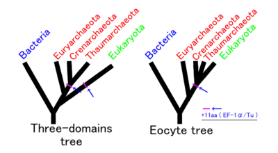 Although more recent data provides evidence in favour of the relationship between eukaryotes and Crenarchaeota through the analysis of elongation factors, earlier experimentation with elongation factors provided evidence against such a relationship.[22] Hasegawa et al. uses these elongation factors to show that eukaryotes and archaebacteria are more closely related than archaebacteria and eubacteria than is explained in this 2 tree system.[22]