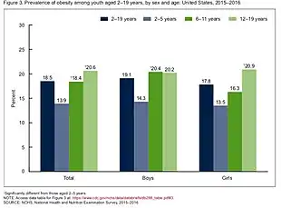 According to the CDC, For the 2015–2016 year, the CDC found that the prevalence of obesity for children aged 2–19 years old, in the U.S., was 18.5%.[4] The current trends show that children aged 12–19 years old, have obesity levels 2.2% higher than children 6–11 years old (20.6% vs. 18.4%), and children 6–11 years old have obesity levels 4.5% higher than children aged 2–5 years old (18.4% vs. 13.9%). Boys, 6–19 years old, have a 6.1% higher prevalence of obesity, than boys aged 2–5 years old (20.4% vs. 14.3%). While girls aged 12–19 years old, have a 7.4% greater prevalence of obesity, than girls aged 2–5 years old (20.9% vs. 13.5%).[4]