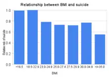 However, other studies indicate that suicide rates increase with extreme obesity, and it is difficult to control for conflating factors such as BMI-related differences in longevity, which have a significant bearing on suicide rates.[51]