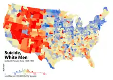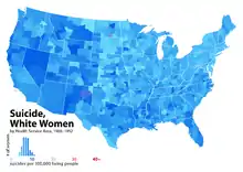 Between 1999-2006, in the United States, suicide was the third leading cause of death in adolescents aged 15 to 19 years, and the fourth leading cause of death for children aged 10 to 14 years.[16] As of 2011, suicide increased in this age group, becoming the second cause of death for youth between the ages of 15 and 24 years, below homicide statistics and above those of accidents.[17] Geographically within the United States, western states have higher rates of suicide. Per 100,000 people, Montana is ranked first, Alaska ranked second, and Wyoming is third.[18] There may be a link between these states and firearm regulations, which make access to guns easier, as statistics show firearm suicides in states with the highest rates of gun ownership are 3.7 times higher for men, and 7.9 times higher for women.[19] These are often rural areas without heavily populated urban communities (which brings social pressure stressors), but may indicate a lack of accessibility to medical and psychological health assistance in these remote areas.[20][21]