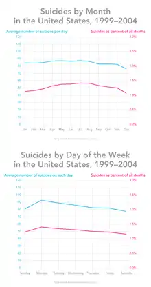 The variation in suicides by day of week is actually greater than any seasonal variation.[57]