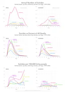 In 2003, in the United States, whites and Asians were nearly 2.5 times more likely to kill themselves than were blacks or Hispanics.[26] There is a marked divergence by age as seen in the chart below. In the eastern portion of the world (primarily in Asian or Pacific-Island countries) the numbers of reported suicides is growing every year.[27]