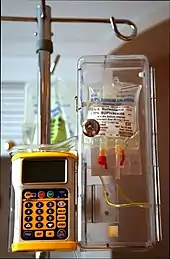 Epidural infusion pump with opioid (sufentanil) and anesthetic (bupivacaine) in a locked box