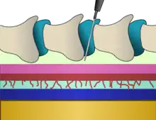 The injection of steroids into the epidural space is sometimes used to treat nerve root pain, radicular pain and inflammation caused by conditions such as spinal disc herniation, degenerative disc disease, and spinal stenosis.[14] The risk of complications from steroid administration is low and complications are usually minor. The specific drug, dose, and frequency of administration impacts the risk for and severity of complications. Complications of epidural steroid administration are similar to the side effects of steroids administered in other manners, and can include higher than normal blood sugar, especially in patients with type 2 diabetes.[14] An epidural blood patch consists of a small amount of a person's own blood is injected into the epidural space. This is done as a method of sealing a hole or leak in the epidural. The injected blood clots at the site of the puncture and closes the leak.[15] This may be used to treat post-dural-puncture headache and leakage of cerebrospinal fluid due to dural puncture, which occurs in approximately 1.5% of epidural analgesia procedures.[16] A small amount of a person's own blood is injected into the epidural space, which clots and closes the site of puncture.[17]