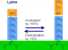 Histone acetylation is a type of epigenetic modification in which acetyl groups are added to lysine on histone tails. Histone acetylation, performed by enzymes known as histone acetyltransferases (HATs), removes the positive charge from lysine and results in gene activation by weakening the histone's interaction with negatively-charged DNA. In contrast, histone deacetylation performed by histone deacetylases (HDACs) results in gene deactivation.
