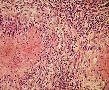 Epithelioid cells are an essential characteristic of epithelioid cell granulomas.[10] Epithelioid cell granuloma can be defined as specifically and structurally organized collection of epithelioid cells, macrophages, lymphocytes and dendritic cells. Foreign-body granulomas may be considered an organized collection of macrophages, including mere collections of giant cells surrounding inert substances like suture material – the so-called "non-immune granulomas." Granuloma formation is associated with pathogens that have learned to evade the host immune system by various means like resisting phagocytosis and killing within the macrophages. Indigestibility of matter by macrophages is a common feature of granulomatous inflammation.[4] Granulomas try to wall off these organisms and prevent their further growth and spread. Historically widespread and destructive diseases such as tuberculosis, leprosy and syphilis are granulomatous conditions. Granuloma formation is also the feature of many more contemporary conditions, like fungal infections, sarcoidosis and Crohn's disease.[4]