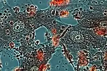 Epithelioid cells formed in culture of mouse peritoneal cells, stimulated by inactivated Mycobacteria tuberculosis, in a micro-chamber for lifetime observation; 14 days of cultivating. Numerous secretory granules are visible in the cytoplasm of cells. In the culture medium epithelioid cell granules and apoptotic bodies from macrophage are visible. Dystrophic altered macrophages are colored red. A method of interferential contrast in polarized light.