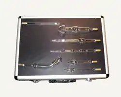 A violet wand typically consists of a hand-held "wand" made of plastic case which encases the mechanical (Tesla coil) or solid state components; a power cable, a collet (7/16" in the United States, 11 mm in Europe), and a cone. The collet is inside the cone end of the violet wand and is where glass and metal probes are inserted to be used with the wand. The cone is there to prevent sparks jumping from the collet directly to subject. Violet wands can be used anywhere on the body but should not be used around the eyes.[2]