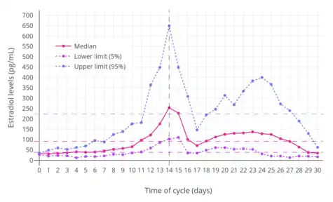 - Values taken from day 1 after LH surge in: Stricker R, Eberhart R, Chevailler MC, Quinn FA, Bischof P, Stricker R (2006). "Establishment of detailed reference values for luteinizing hormone, follicle stimulating hormone, estradiol, and progesterone during different phases of the menstrual cycle on the Abbott ARCHITECT analyzer". Clinical Chemistry and Laboratory Medicine. 44 (7): 883–7. doi:10.1515/CCLM.2006.160. PMID 16776638. S2CID 524952. as PDF