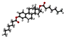 Estradiol dienanthate (EDE), sold under the brand names Climacteron among others, is a long-acting estrogen medication which was previously used in menopausal hormone therapy for women and to suppress lactation in women.[1][2][3][4] It was formulated in combination with estradiol benzoate (EB), a short-acting estrogen, and testosterone enanthate benzilic acid hydrazone (TEBH), a long-acting androgen/anabolic steroid.[2][3][4] EDE has not been made available for medical use alone.[5] The medication, in combination with EB and TEBH, was given by injection into muscle once or at regular intervals, for instance once every 6 weeks.[6][7][8]